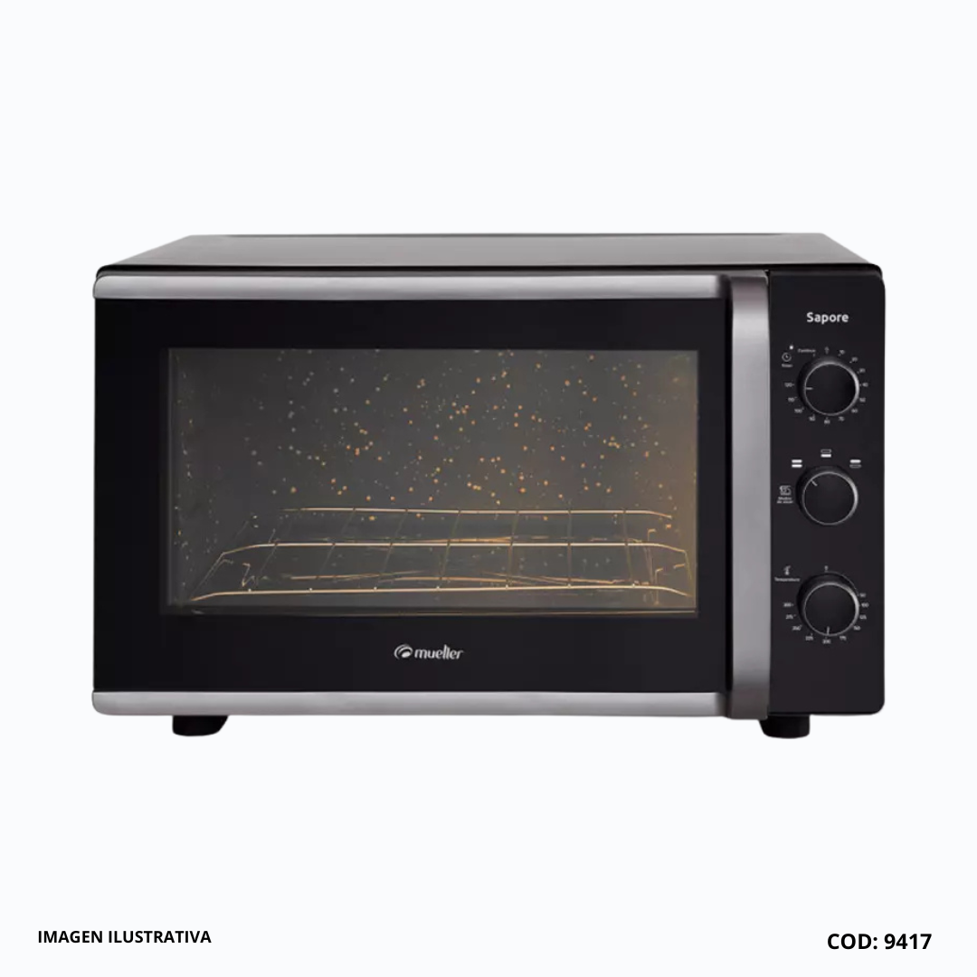 El Horno Eléctrico Mueller Sapore G3 Negro se destaca por su diseño moderno, compacto y funcional, ideal para cualquier cocina. Su cuerpo negro mate combina elegancia y durabilidad, convirtiéndolo en un complemento que se adapta perfectamente al estilo de tu espacio. Este horno no solo aporta estética, sino también practicidad al ser lo suficientemente compacto para encajar en áreas más pequeñas sin comprometer su capacidad de rendimiento.