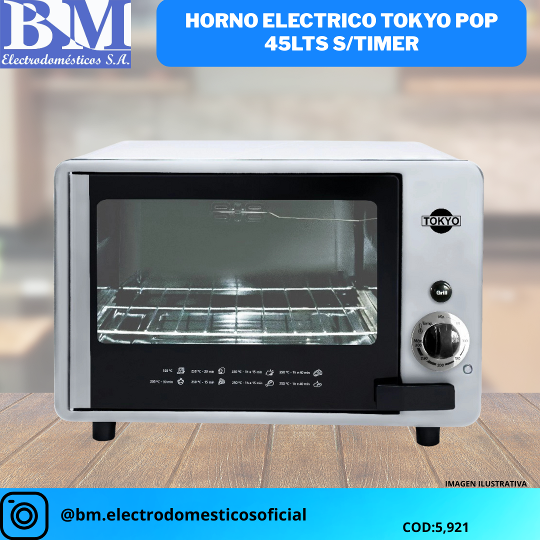 Descubre la versatilidad del Horno Eléctrico Tokyo Pop 45LTS S/TIMER, diseñado para adaptarse a tus necesidades culinarias diarias. Con una capacidad de 45 litros, este horno se convierte en el compañero perfecto para preparar deliciosos platillos sin ocupar demasiado espacio en tu cocina. Ideal tanto para principiantes como para expertos en la cocina, este electrodoméstico combina eficiencia y rendimiento en un diseño compacto.